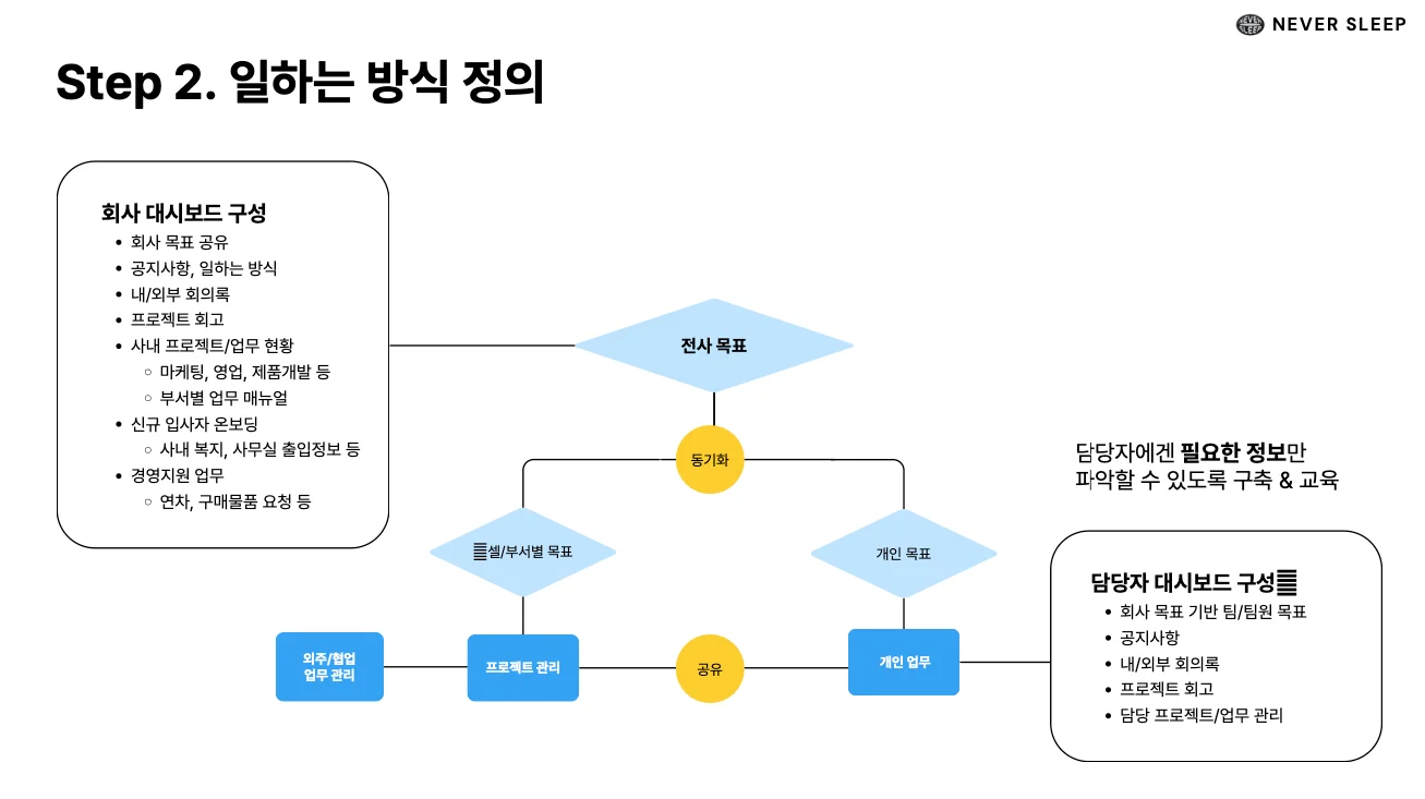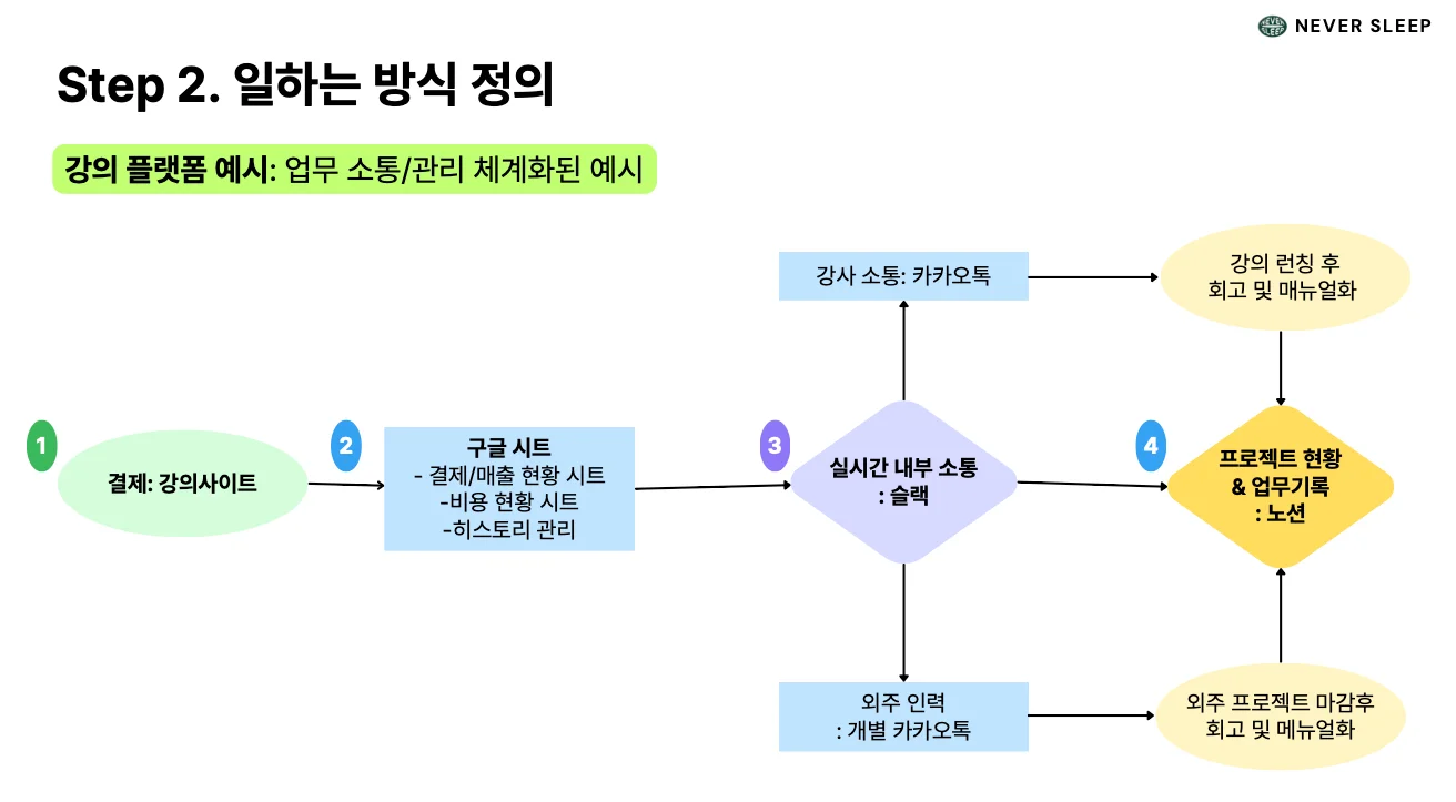 이제부터는 업무를 시각화하여 ‘보이는 형태’로 정리하고, 일하는 방식을 문서화하고, 중요한 정보들을 시스템화할 필요가 있어요. 이 과정을 힘들다고 회피하면, 결국 대표님이 계속해서 사소한 문제까지 직접 해결해야 하는 악순환이 반복돼요.