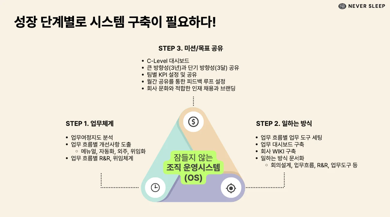 이런 상황에서 살아남으려면, 결국 우리 조직에 최적화된 운영시스템이 필요해요. 이 시스템이 제대로 작동하려면 업무 위임, 일하는 방식의 공유, 목표 설정이 핵심이 돼요.