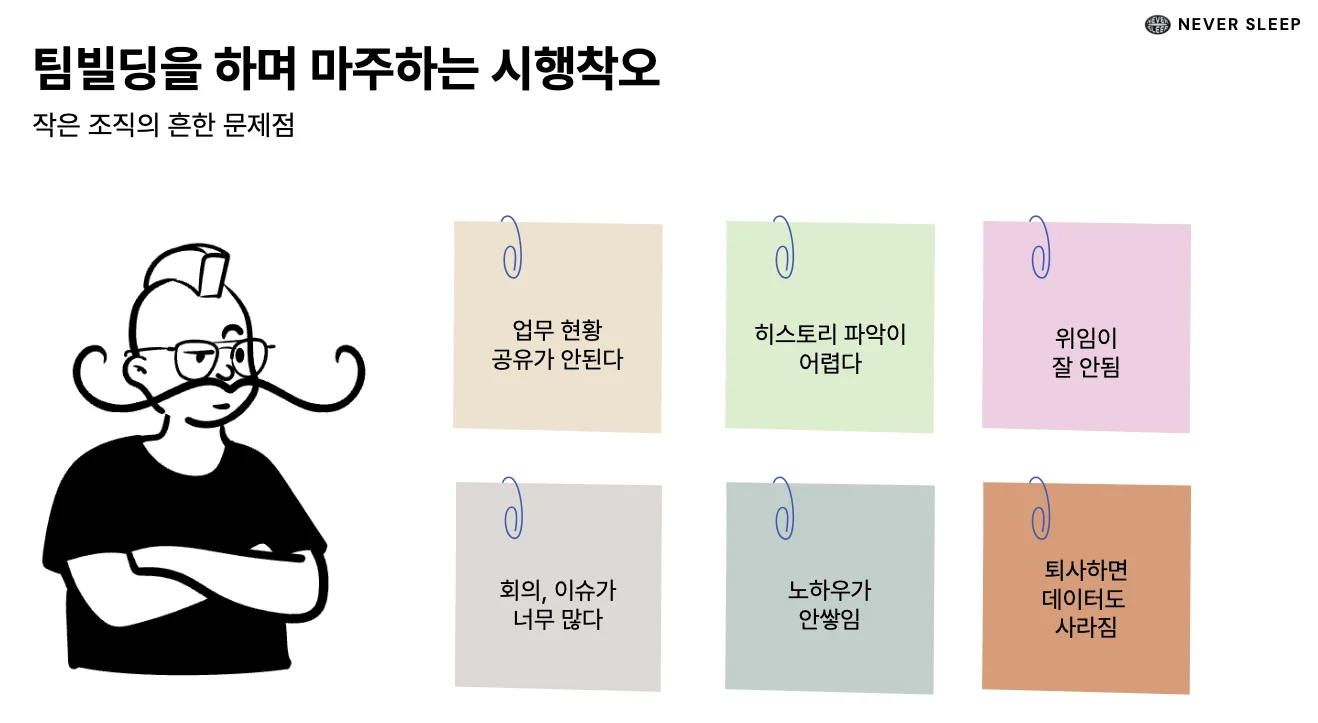 5명 이하의 팀에서는 구두로 정보를 공유해도 문제가 되지 않아요. 하지만 팀원이 10명, 15명으로 늘어나면 말로만 소통하는 것이 불가능해져요.