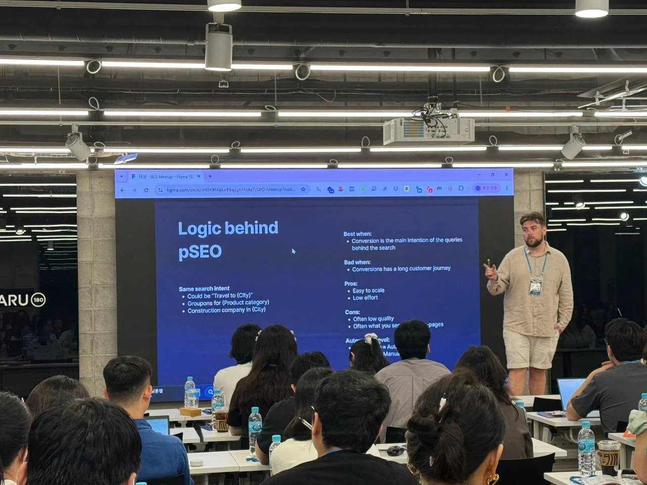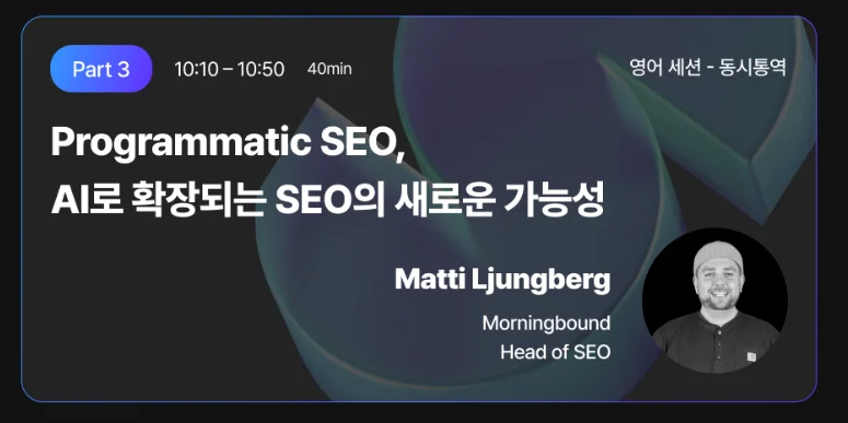 개인적으로 가장 궁금했던 주제 중 하나는 'AI 발전이 프로그래매틱 SEO에 가져올 새로운 가능성'이었습니다. 이번 주제의 연사는 덴마크 디지털 마케팅 에이전시 모닝바운드(Morningbound)의 SEO 헤드이자 AI 기반 프로그래매틱 SEO 전문 기업 커널 AI(Kernel AI)의 공동 대표인 매티 륭버그(Matti Ljungberg)였는데요, 그는 빠르게 변화하는 SEO 환경 속에서 AI를 활용한 경험과 사례를 공유했습니다. AI를 통해 콘텐츠 품질을 높이고 대규모 데이터 세트를 효율적으로 처리하는 방법을 강조했는데요, 전통적인 프로그래매틱 SEO와 AI 기반 프로그래매틱 SEO의 차이를 이번 글에서 확인하실 수 있어요.
