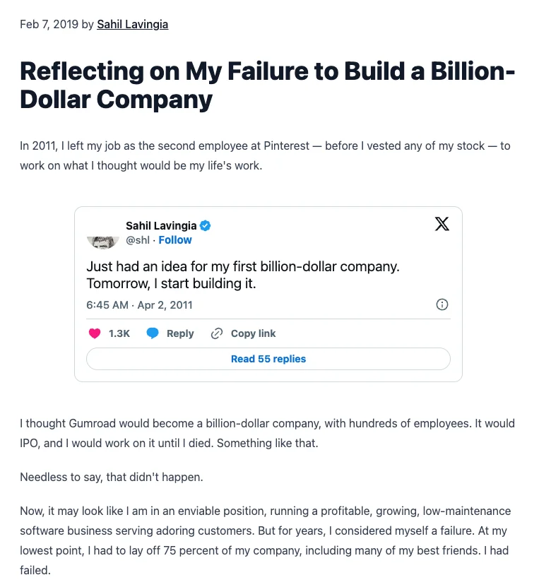 Sahil은 이 과정에서 자신의 실패 경험을 솔직하게 공유하는 블로그 글을 작성했고, 이 글이 100만 뷰 이상의 엄청난 반향을 일으키며 Gumroad의 브랜드 인지도를 크게 높였습니다. 그의 솔직함이 강력한 마케팅 전략이 된 거죠.