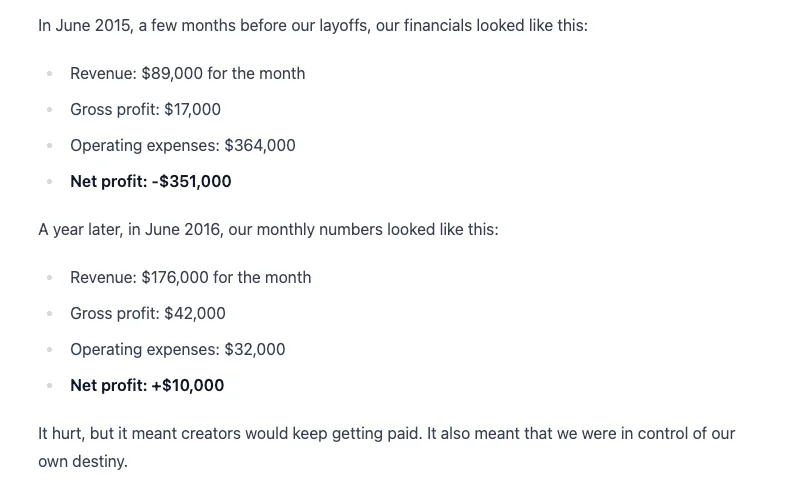 시리즈 B 투자 유치 실패 후, 팀을 75% 감축하고 비용을 최소화했어요. 한동안 적자였던 사업이 월 1만 달러 이상의 순이익을 내는 수익 모델로 전환되었죠.
