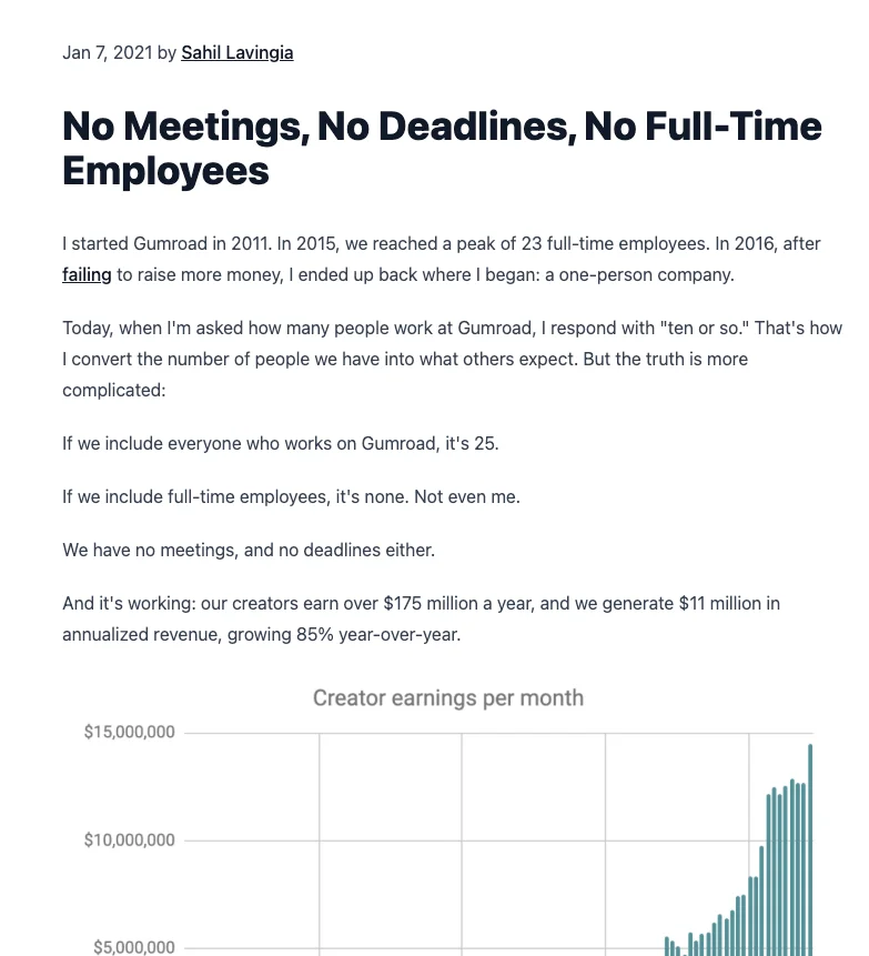 Gumroad는 사무실을 없애고 100% 원격 근무로 전환했습니다. 회의도, 마감일도 없이 운영합니다. 비동기식 커뮤니케이션 중심 문화로, 소수 인력으로도 연 매출 1,100만 달러 이상을 달성했습니다.