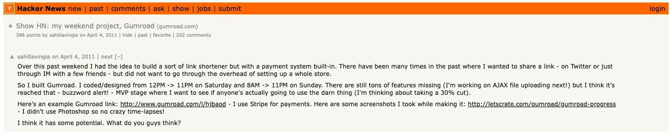 MVP(최소 기능 제품)부터 시작된 Gumroad의 여정은 데이터 중심 의사결정의 좋은 사례예요. Sahil은 2011년 주말 동안 기본적인 MVP를 직접 개발했습니다. 기능은 극도로 단순했어요. 디지털 파일 업로드, 판매 링크 생성, 결제 처리. 이게 전부였죠.