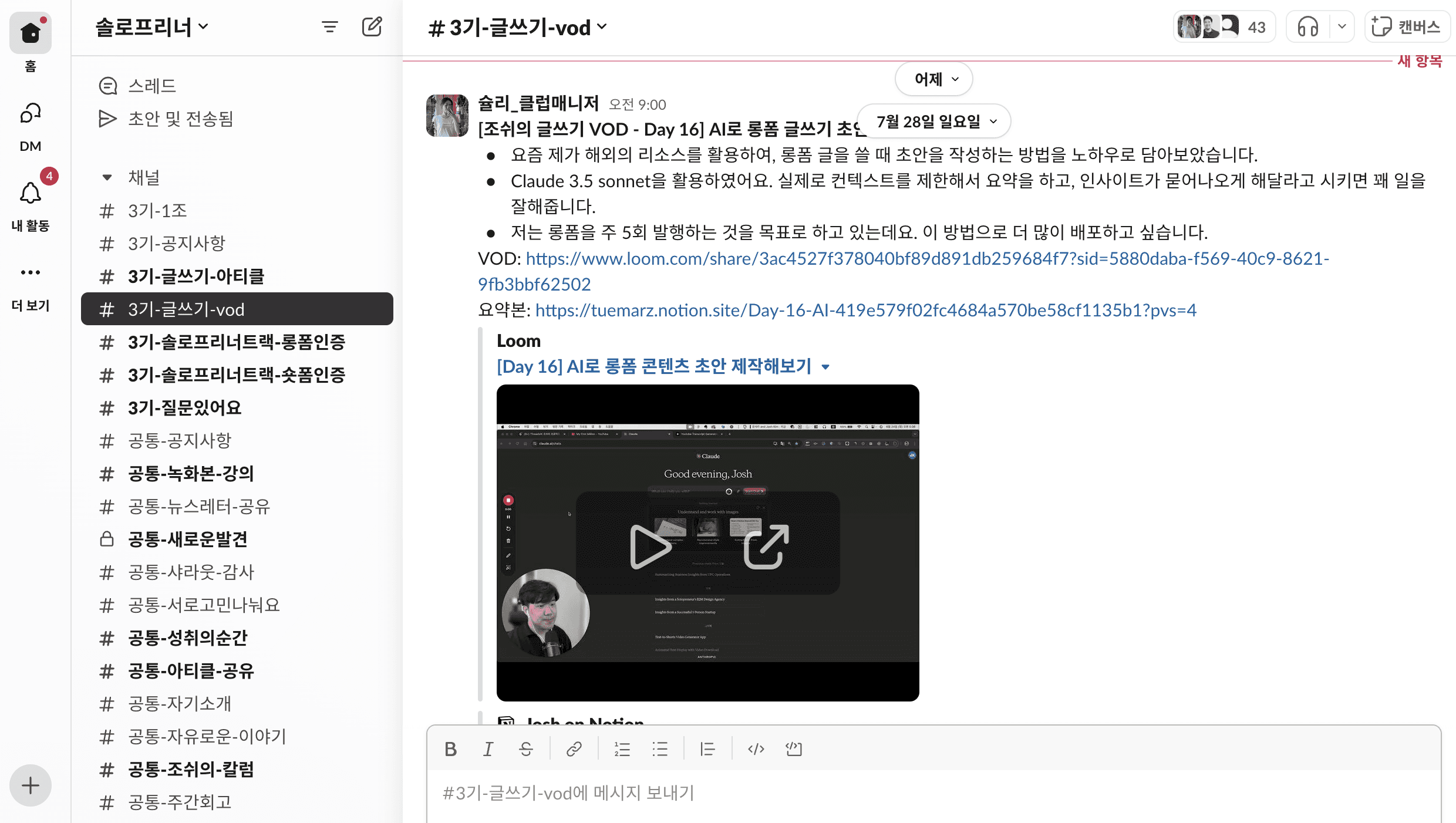 "최근에 클로드를 활용해 엄청 시간을 단축하고 있습니다. 글쓰기를 하시는 입장에서는 클로드 3.5 sonnet을 한번 활용해 보세요. 정말 괜찮은 글을 작성해 줄 거예요."