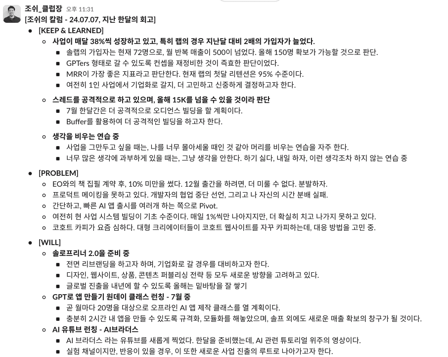 "등록했던 멤버분이 나갈 때가 가장 타격이 컸어요. 코호트 프로그램은 프로그램 기간이 끝나고 헤어지는 명분이 있으니 괜찮아요. 솔로프리너 랩은 잘 만들려고 노력을 많이 하고 있는데도 떠나시는 분을 보니까 힘들더라고요."