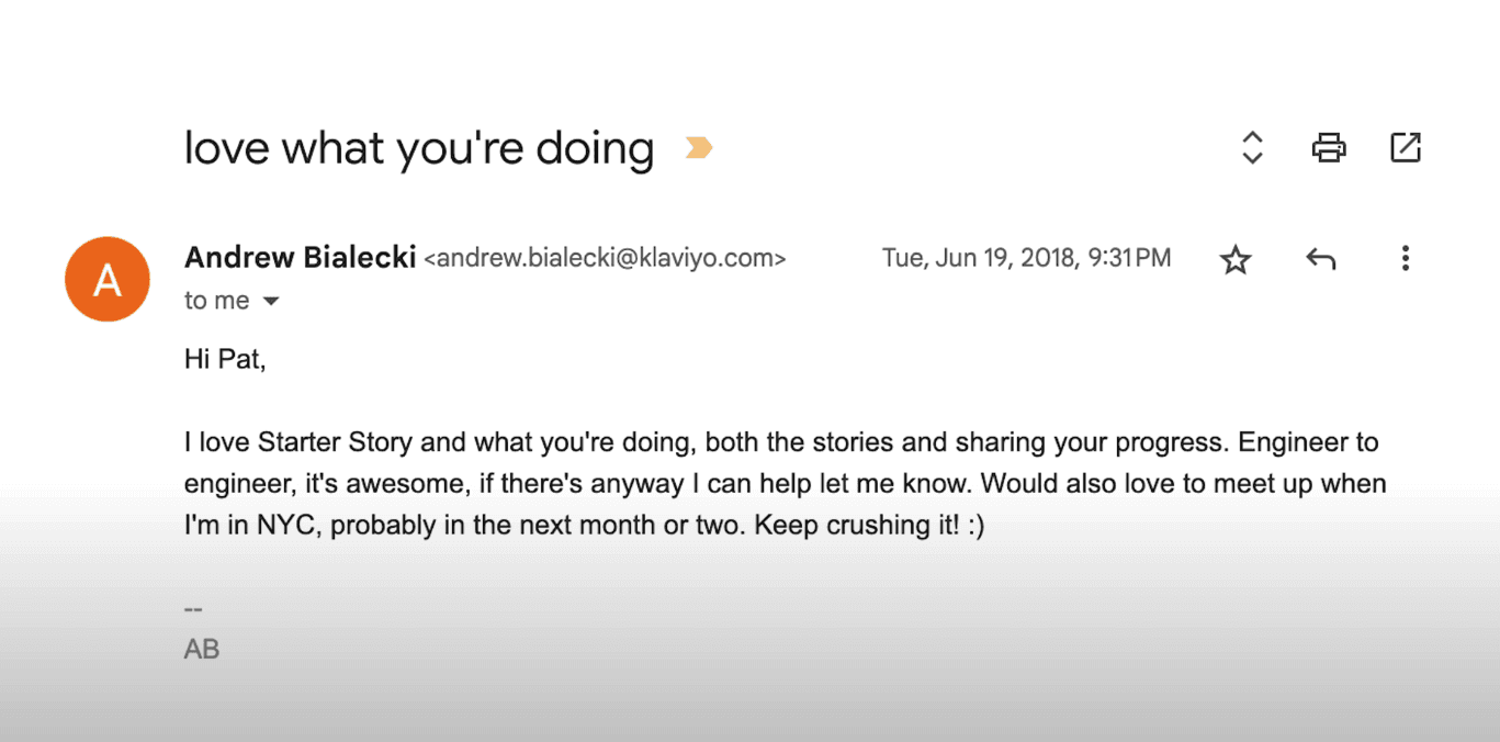 이메일 마케팅 도구 기업 Klaviyo 대표가 먼저 Pat에게 제안 메일을 보냈습니다. Starter Story의 콘텐츠에 큰 매력을 느꼈기 때문인데요, 그렇게 연간 $48K 규모(월 6천만원 이상)의 사이트/뉴스레터 스폰서십 계약을 맺었습니다. 이 계약은 첫 안정적인 수익원이 되었습니다.