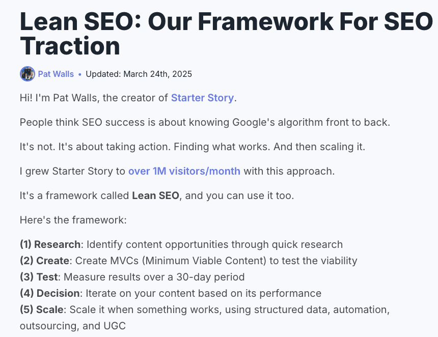 그의 Lean SEO 접근법은 리소스가 제한된 스타트업에 완벽하게 맞는 전략이었습니다. 수백 개의 페이지를 실험한 후, 성과가 좋은 일부 콘텐츠만 수만 단어 분량의 권위 있는 가이드로 확장했습니다.